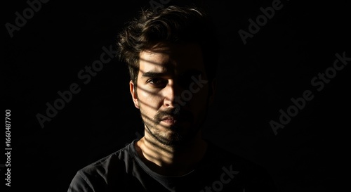 © Miracle, Naklejka premium Mans face shadowed by light dark hair and beard visible