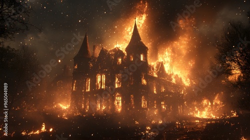 Naklejka premium Mansion being devoured by fire, night sky ablaze with sparks, ash raining down, windows cracking from the heat, a haunting sight of destruction