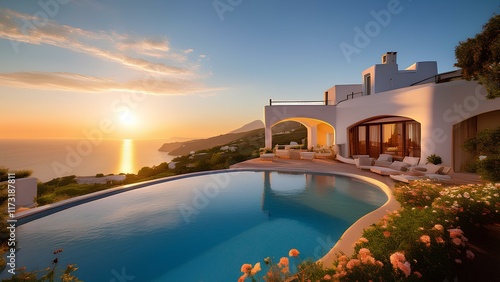 © Skoles, Fototapeta premium Mansion with pool on the shore of the azure sea at sunset. House on the top of the mountain overlooking the sparkling sea.