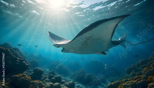 Fototapeta premium Manta ray gliding elegantly through the ocean depths with large wings...