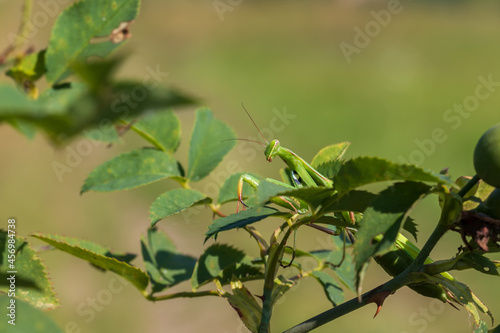 © Roman Bjuty, Naklejka premium Mantis - Mantis religiosa green animal sitting on a blade of grass.