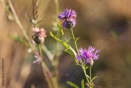 Fototapeta premium Mantis - Mantis religiosa green animal sitting on a blade of grass in a meadow