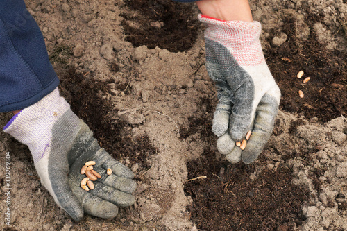 Fototapeta premium Manual sowing of beans on the bed. Spring gardening.