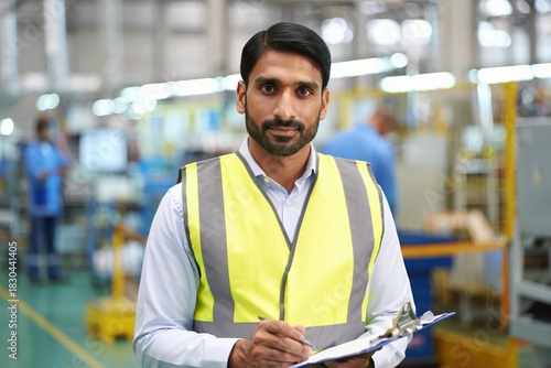 © Aliaksandr Barouski, Fototapeta premium Manufacturing plant manager reviews production floor with clipboard and focus