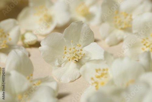 Fototapeta premium Many aromatic jasmine flowers on beige background, closeup