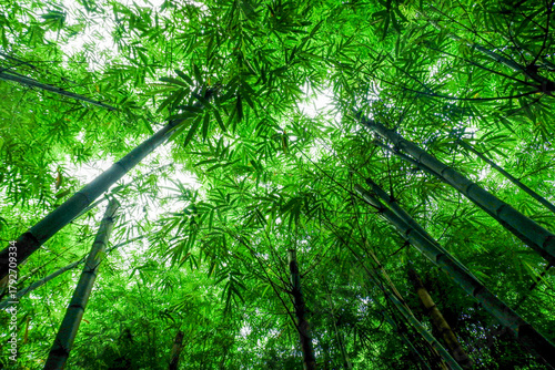 Naklejka premium Many bamboo stalks and light beam,bamboo thick and green,bamboo forest with...
