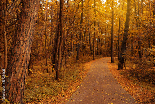 Naklejka premium Many beautiful trees and pathway with fallen leaves in autumn park