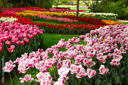© New Africa, Fototapeta premium Many beautiful tulip flowers in park. Spring season