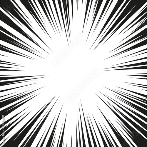 © Oleksandr, Naklejka premium Many black comic radial speed Lines on white base. Effect power explosion illustration. Comic book design element. Graphic Explosion with Speed Lines in comic book style. Vector Illustration