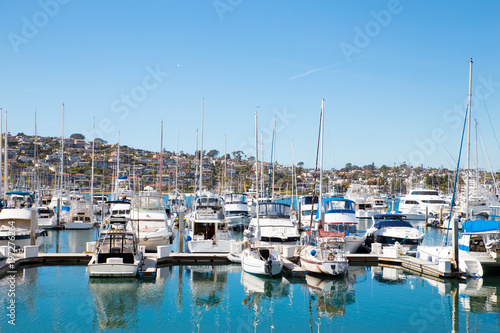 Obraz premium Many boats at San Diego California marina district with the hills of Point...