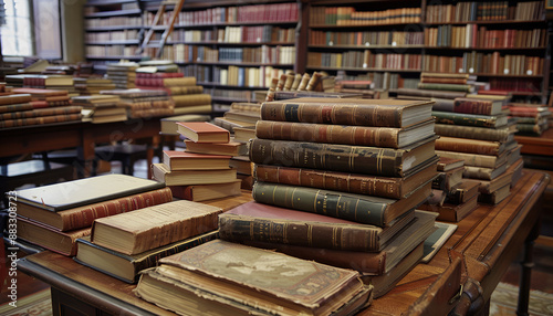 Fototapeta premium Many books on wooden table in library