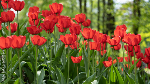 © bonilook, Obraz premium Many bright red tulips in the Park on a Sunny day