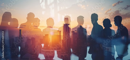 © SHI, Obraz premium Many business people in the city office building double exposure images, the background shows the partners successful business transactions, teamwork, trust and the concept of agreement.