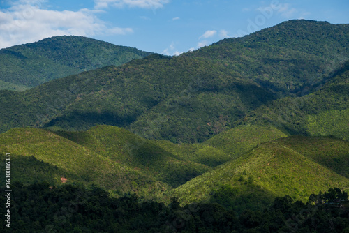 Fototapeta premium many cabin huts of a small village on the one of slope of complex mountain in...