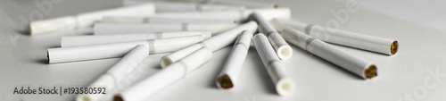 © Konstiantyn Zapylaie, Fototapeta premium Many cigarettes lie on a light background.