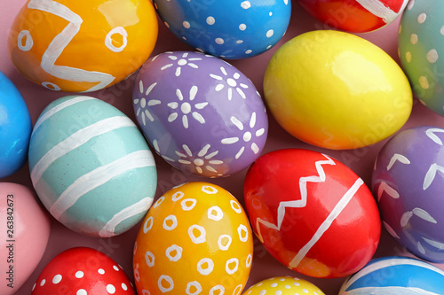 Obraz premium Many colorful painted Easter eggs as background, top view