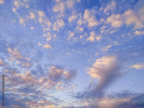 © Vitalii, Obraz premium Many colourful clouds in sky, beautiful background. Evening sunset sky with small bright clouds, calm atmosphere