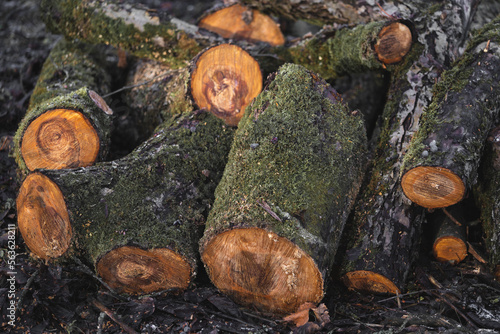 © Tsyb Oleh, Fototapeta premium many cut trees in the forest for firewood