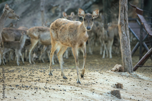 © songphon, Fototapeta premium many deers in the zoo looking at camera.