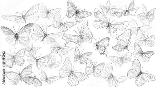 © Ariestia, Fototapeta premium Many detailed line drawings of butterflies in flight.