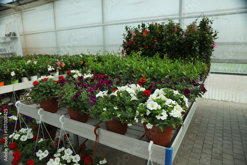 © New Africa, Fototapeta premium Many different beautiful potted plants in garden center