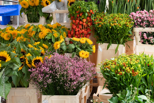 Fototapeta premium Many different flowers at a floral shop. Showcasing Background mix of colors.