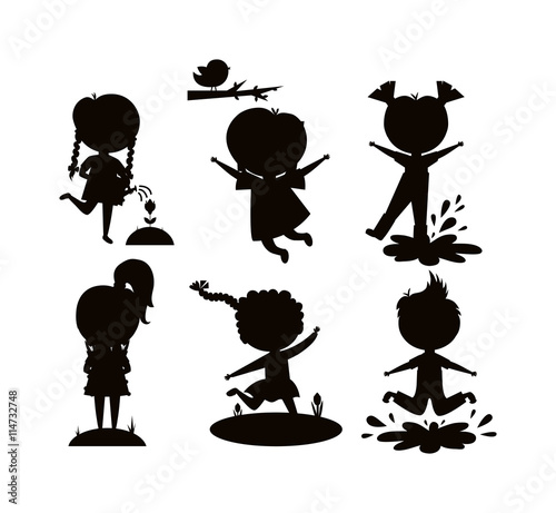 © Vectorvstocker, Naklejka premium Many different summer kids, boys and girls black silhouette running in park on sunny summer day. Summer kids casual clothes and playing summer kids. Summer kids outdoor leisure activity. Children play