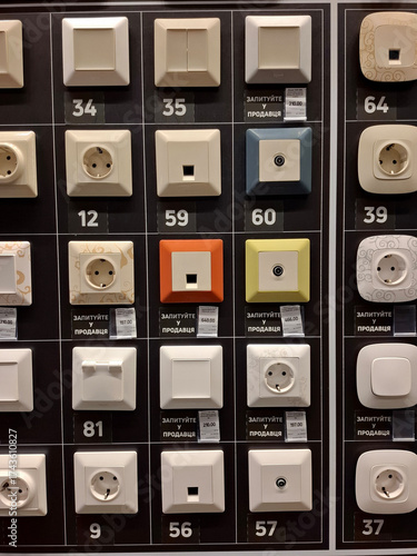 © Harmony Video Pro, Fototapeta premium Many electric light switches in construction hypermarket