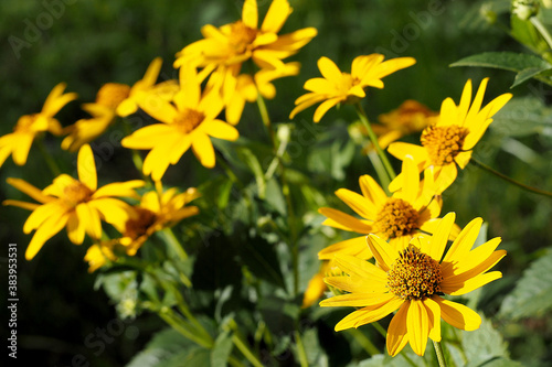 Fototapeta premium many flowers of yellow Echinacea with green leaves on a summer day ....