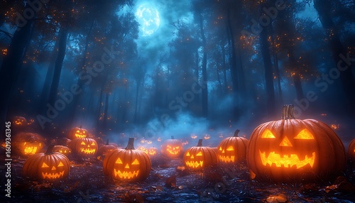 Naklejka premium Many glowing jack o lanterns in a dark foggy forest at night halloween pumpkin