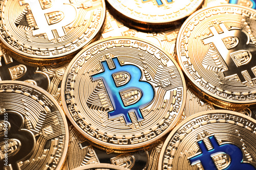 © Africa Studio, Fototapeta premium Many golden bitcoins, closeup
