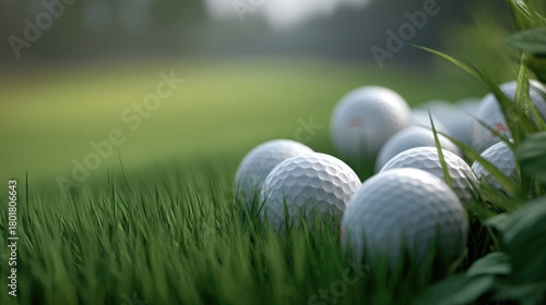 Naklejka premium Many golf balls on green grass field close up outdoor sports equipment summer...