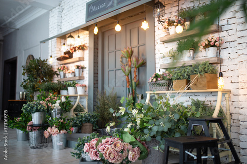 Fototapeta premium many green flowers on the background of a white brick wall in the interior