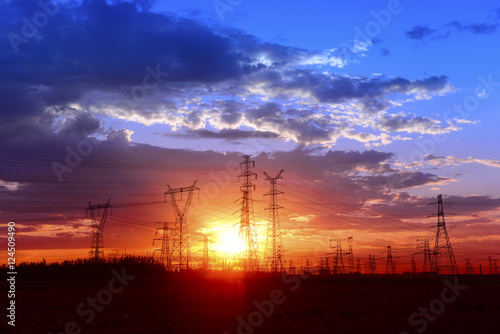 © hanmaomin, Fototapeta premium Many high voltage towers under the sunset