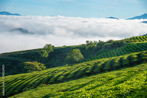© Nhan, Obraz premium Many houses in in the mist in the morning. Early morning fog and mist burns off over large houses nestled in green rolling hills