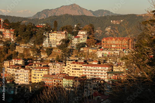 © sanirimpan, Fototapeta premium Many houses on a densely populated hillside in Shimla Northern India. House in the foothills of the Himalaya mountains capital of Himachal Pradesh. Ariel view of Shimla town.