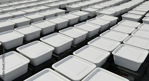 © raditex, Obraz premium Many identical white plastic containers in grid pattern