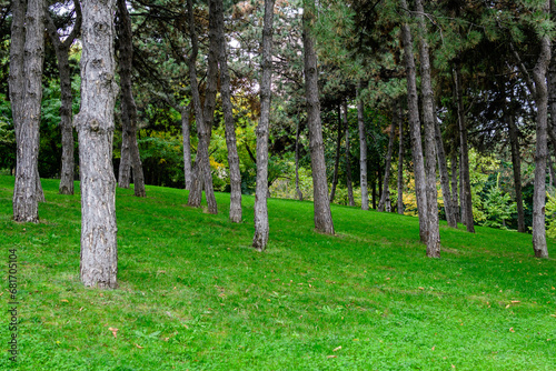 Fototapeta premium Many large pine trees trunks and vivid green grass in a garden during a sunny autumn day, beautiful outdoor background photographed with soft focus.