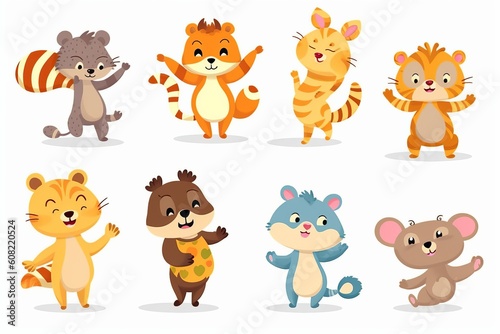 © standret, Naklejka premium Many of the animals in cartoon style. Baby bear, tiger, lion, monkey, penguin, raccoon. Beautiful illustration picture. Generative AI