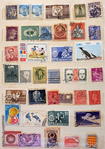 Obraz premium many old stamps on a philately catalog page 02.Jul.2020 in Sovata city - Romania