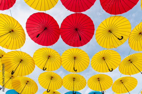 Naklejka premium Many open in sky umbrellas give a guarantee that rain will not