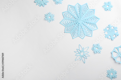 Fototapeta premium Many paper snowflakes on white background, flat lay. Space for text