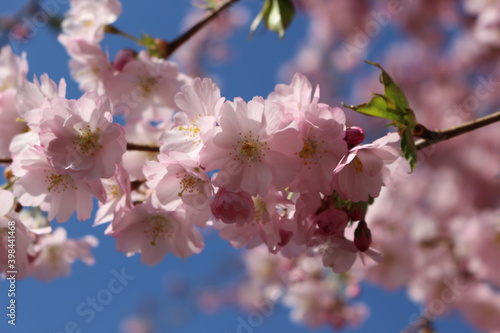 © Yuliya, Fototapeta premium Many pink flowers bloomed on the sakura tree in the garden in the spring