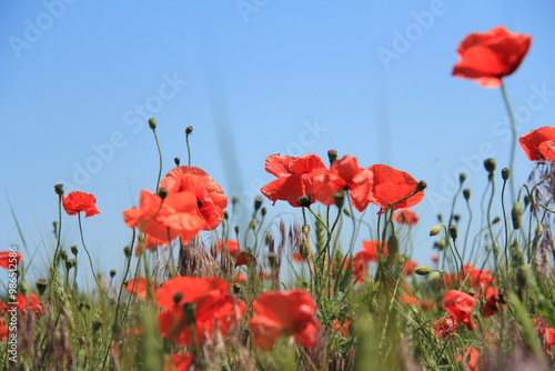 © Nastyusha666, Obraz premium Many poppy flowers in field and blue sky