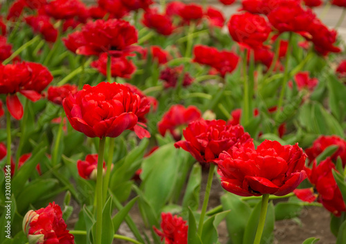 © Peter, Obraz premium Many red tulips with green leaves. Beautiful flowers background, texture