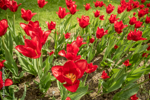 © Zdenar Adamsen, Fototapeta premium Many red tulips with green stems in the flowerbed. In the flower is pistil and stigma. Illuminated by sun.