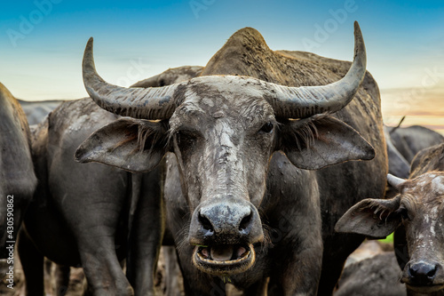 Naklejka premium Many Sea Buffaloes residents of enclosure at Talay Noi is a river basin at...