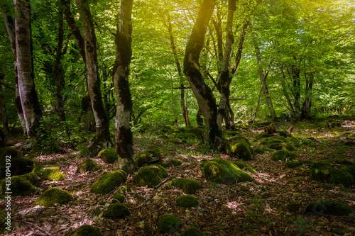 © alexmu, Naklejka premium Many stones covered with moss lying in the forest