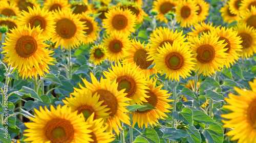Fototapeta premium Many sunflower flowers are in full bloom. The field is sown with oilseeds - sunflower.