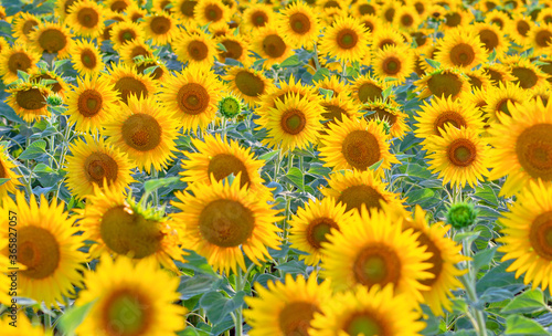 Obraz premium Many sunflower flowers are in full bloom. The field is sown with oilseeds - sunflower.